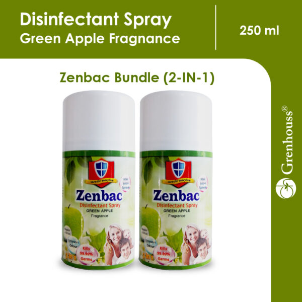 Zenbac Disinfectant is formulated in Green Apple fragrances with sanitizing power that eliminates odour and disinfectant power that kill 99.99% of bacteria commonly found airboned in enclosed areas or on any surfaces. Zenbac Disinfectant is a more effective metered aerosol”, providing both longer lasting effect and healthier air over a larger volume area. It is ideal for places such as washrooms, car interiors, building lobbies, hospitals, reception halls & high traffic areas etc.